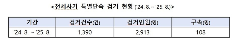 경찰청은 전국 경찰서에 전담수사팀(지능팀)을 운영 중이며, ’24년 8월 이후 ’25년 8월까지 전세사기 사범 총 2,913명(구속 108명)을 추가 검거했다.
