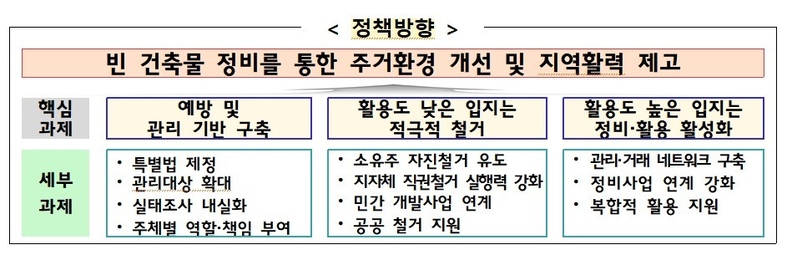 예방 및 관리 기반 구축 방안을 살펴보면, 빈 건축물을 선제적이고 체계적으로 관리하기 위해 관리대상 확대, 실태조사 등 제도적 기반을 마련을 주요 내용으로 하는 「빈 건축물 정비 특별법」을 제정한다.