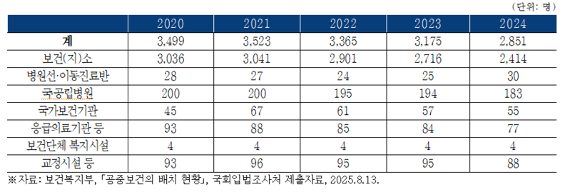 지방의 의료지원 악화는 필수의료인력의 감소와 밀접한 연관이 있다. 공중보건의사(의과)의 배치 인원은 3,499명(’20) → 2,851(’24)으로 급감한 것으로 나타났다.