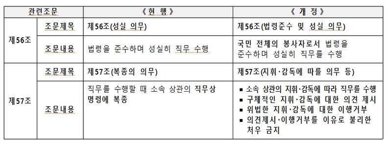이번 개정안은 공무원의 ‘복종의 의무’를 삭제하는 대신 상관의 지휘・감독에 따를 의무로 변경했다.