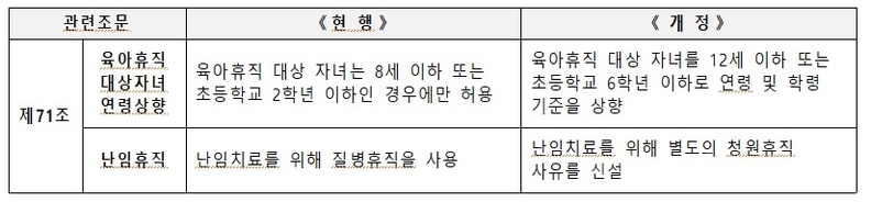 이번 개정안은 육아휴직 대상자녀 나이 기준을 상향하고, 난임휴직을 별도의 휴직 사유로 신설한다.