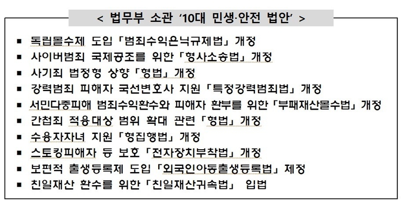 법무부가 신속한 입법을 요청한 ‘10대 법안’에는 최근 캄보디아 범죄단체 사태로 국민적 관심이 커진 독립몰수제 도입, 디지털성범죄‧사이버범죄 등 초국가적 범죄의 전자증거 보전을 위한 형사소송법 개정안이 포함됐다.