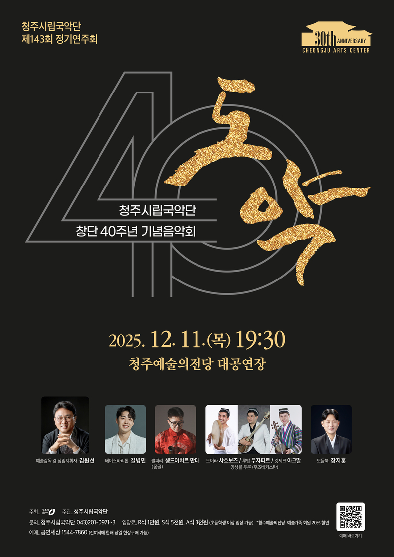 이어 12월 11일 청주예술의전당 대공연장에서 청주시립국악단(예술감독 겸 상임지휘자 김원선)이 제143회 정기연주회 ‘도약’을 개최한다.