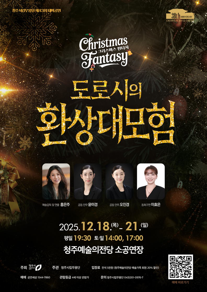 마지막으로 12월 18일부터 21일까지 청주예술의전당 소공연장에서 청주시립무용단(예술감독 겸 상임안무자 홍은주)이 제43회 테마공연 크리스마스 판타지 ‘도로시의 환상대모험’을 공연한다.