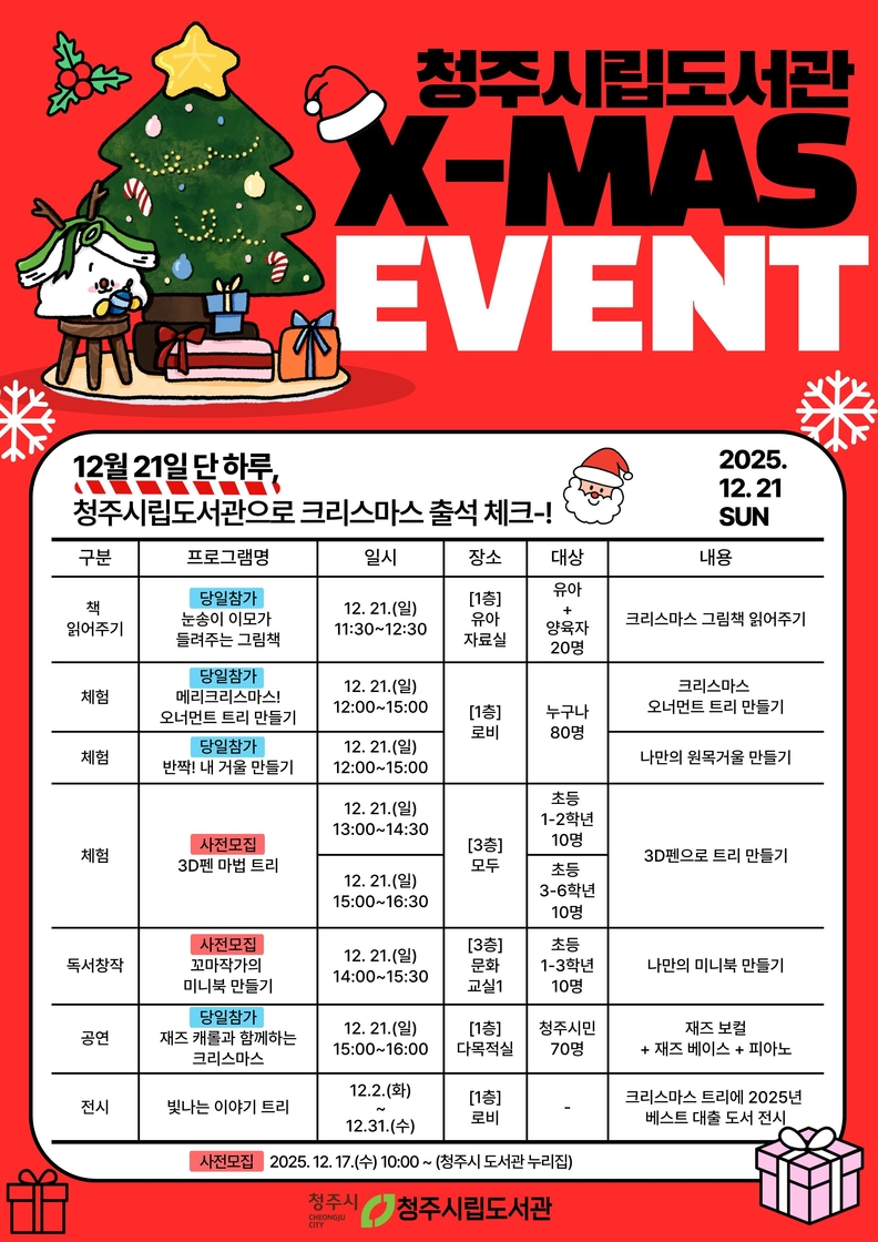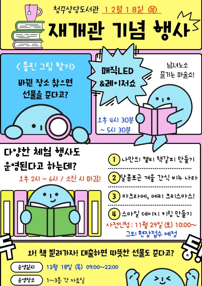 또한 △상당도서관 재개관 기념 시민참여 행사(12월18일) △오송도서관(12월20일)·청주시립도서관(12월21일) 크리스마스 특별 프로그램 등을 비롯해 권역별 도서관에서도 다양한 체험·공연·이벤트가 진행된다.