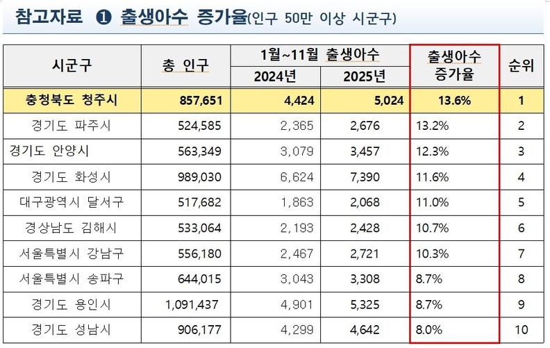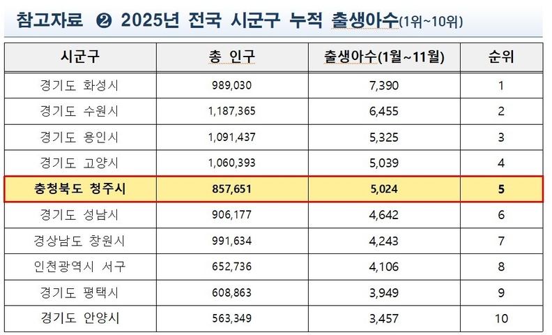 이는 전년 동월 대비 13.6% 증가한 수치로, 인구 50만명 이상 전국 시‧군‧구 중 청주시가 출생아 수 증가율이 1위인 것으로 나타났다. 11월 기준 올해 출생아 수 5천명을 넘긴 지역은 전국 229개 시‧군‧구 중 경기도 화성시를 비롯한 5개 도시로, 비수도권에서는 청주시가 유일하다.