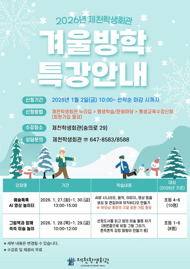 제천학생회관은 겨울방학을 맞아 인공지능(AI)을 활용한 디지털 창작 활동 및 그림책을 연계한 미술 놀이 프로그램 등 창의·예술 체험 중심의 특별 프로그램을 운영한다.