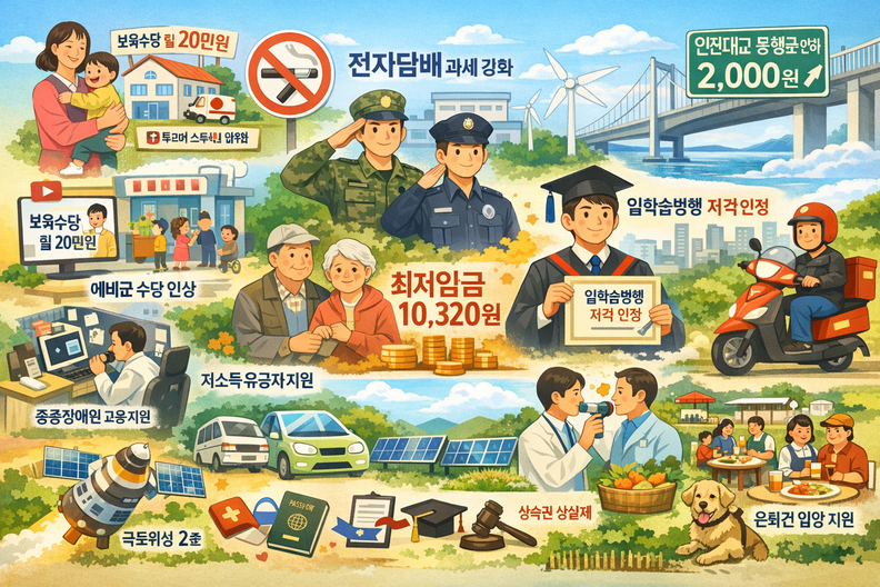 ▶ 저소득 참전유공자 배우자 생계지원금 지급, ▶ 중증장애인 고용 장려금 지급, ▶ ‘일학습병행 자격’ 취득자를 국가기술자격 취득자로 인정, ▶ 폐기능검사 국가건강검진 도입, ▶ ‘위기아동청년법’ 시행 전담기관 지정 관리, ▶ 개정 ‘노동조합 및 노동관계조정법’ 시행, ▶ 육아기 10시 출근제 신설(초등 6학년 이하), ▶ 2026년 최저임금 10,320원