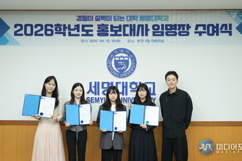 세명대학교는 지난 15일 교내 대회의실에서 홍보대사 ‘세움(세명대의 아름다움) 10기’ 임명장 수여식을 개최했다고 밝혔다.